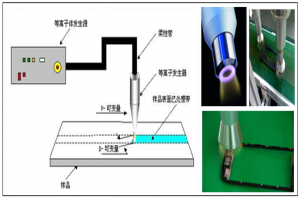 大气等离子清洗机由等离子发生器、气体输送系统、压力保护系统及等离子喷头等部分组成。等离子发生器产生高压高频能量在喷嘴钢管中被激活和被控制的辉光放电中将空气电离,产生了低温等离子体,借助压缩空气将等离子体喷向工件表面,当等离子体与被处理物体表面相遇时,产生了一系列化学作用和物理变化,表面得到了清洁,去除了碳化氢类污物,如油脂、辅助添加剂等,根据材料成分,其表面分子链结构得到了改变。建立了羟基、碳基等自由基团,这些基团对各种涂敷材料具有促进其粘合的作用,在粘合和油漆应用时得到了优化。在同样效果下,应用等离子体处理表面可以得到非常薄的高张力涂层表面,不需其他机械、化学处理等任何强烈作用成分来增加粘合